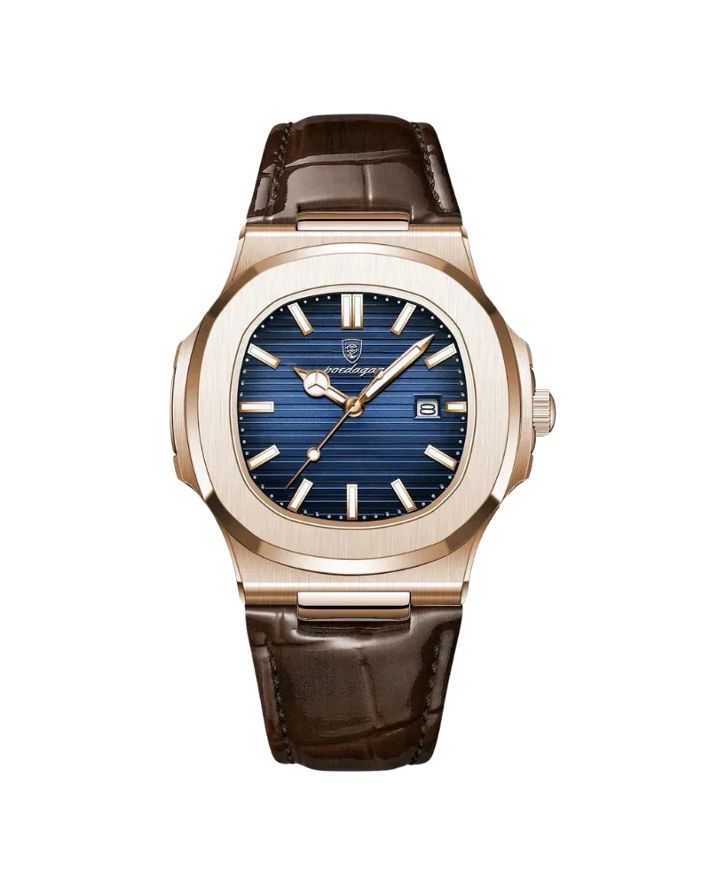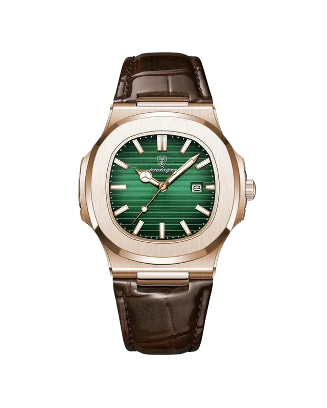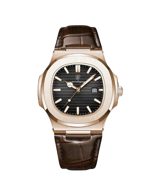 Caixa de aço inoxidável e pulseira de couro, unindo durabilidade e estilo.